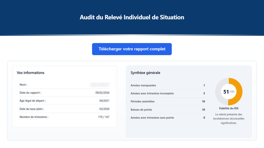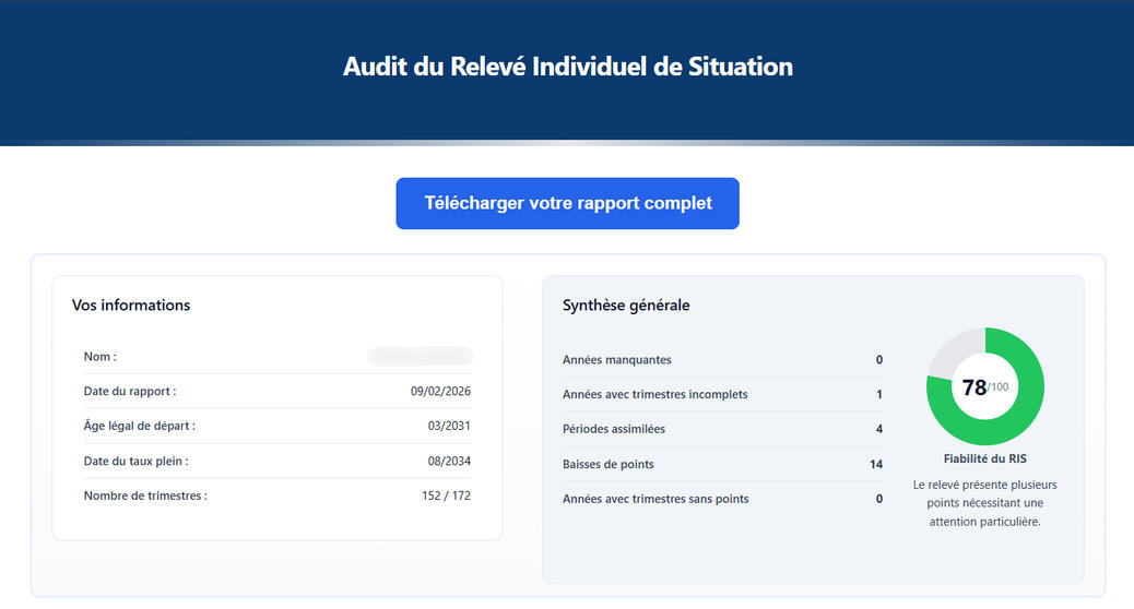 - la cohérence entre revenus, trimestres et points enregistrésChaque anomalie identifiée est signalée comme une zone de vigilance.Une synthèse récapitulative présente le nombre d’anomalies détectées.Un score de fiabilité sur 100 est également établi afin d’indiquer le niveau de confiance que l’on peut accorder au relevé de carrière tel qu’il est enregistré.
